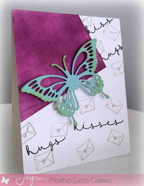 This is my card, I made this using two different die cuts from Gina Marie, the stitched loop border and the XL Butterfly that I combined with Hugs and Smiles stamp set from Joy Clair Stamps. If you want you can find the complete tutorial to create this HERE in my blog.